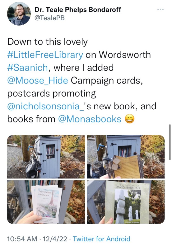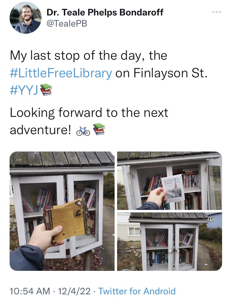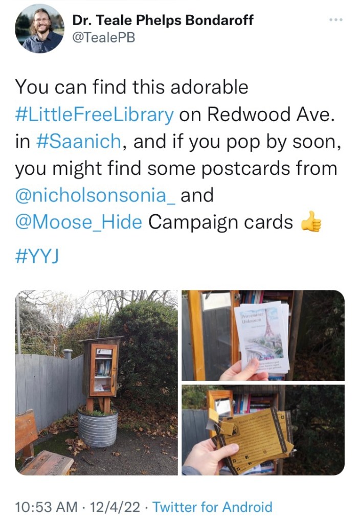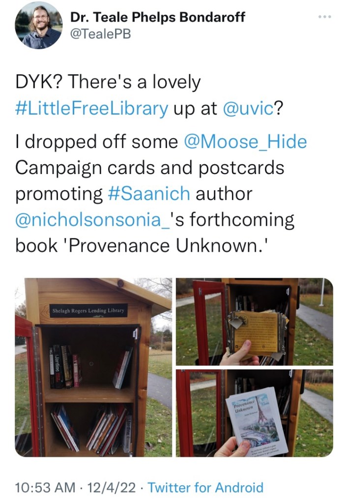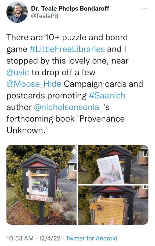 If you follow me on Twitter or Instagram, you’ll already know how thrilled I am to have my Provenance Unknown postcards going into Little Free Library locations across Greater Victoria! A huge thanks to Dr. Teale Phelps Bonderoff (Greater Victoria Placemaking Network’s Pocket Places Project) for supporting local authors and delivering this promo swag all over the city.